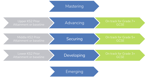 Our framework is based on our KS3 descriptors showing the progression of a student from KS3 to KS4. In subjects, raw marks/percentages that a student achieves will be converted to an attainment grade. The attainment grade helps to give an indication of the level they would then be likely to go on to achieve at KS4.