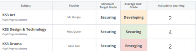 Grades in the student reports are colour coded to indicate the progress a student has made since KS2 or a baseline assessment at the start of KS3, compared to their target grade.