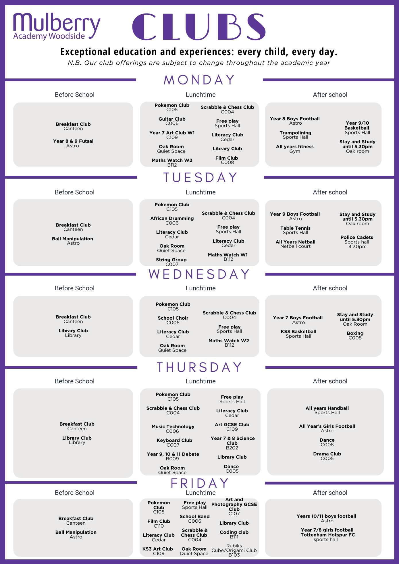 After school clubs will start between 3:10 to 3:20 p.m. and finish between 4:10 to 4:20 p.m.